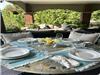 | It was back to the Green Cottage in Bayfield for the sisters. We had a wonderful time and glorious weather. We had morning coffee and muffins in the sitting room off the kitchen to start our day. And then spent the rest of the day outside on the veranda. It is so comfortable and cosy. It is always fun to see the changes Kim makes each year! The plants and the flowers were gorgeous and added to our love of being outside. We had lunches at the picnic table, an English tea in the dining room with lovely dishes, tea cups and tea pots and the three tiered servers. It was very English indeed. We had drinks and munchies while sitting on comfy couches, did puzzles at the picnic table and four of us played euchre at the table. There was room for all of us and our activities on the veranda. We even took naps on the swing. This year there were lots of blue jays, robins, cardinals, and a very cheeky squirrel that left his messy nuts for us to find in the morning. The sundowns were gorgeous. So as not to be too sedentary, we played ring toss and bocce ball. All in all we had a great time being together and relaxing. This cottage has everything you could possibly need to have a good time. There is enough to do in the surrounding area and at the cottage to keep you entertained. It rates a most definite 5.
