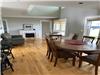 Coin salon avec foyer et coin repas avec vue à travers les nombreuses fenêtres de la maison