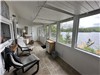 Facing the water is a 30-ft wide screened-in porch with panoramic views of the lake. The original drop-down shutters for the screens add an authentic aura to this inviting space. Chairs, end table, and a wide-open view to the dock and lake create a simple, relaxing spot that is full of old-fashioned charm. Perfect for coffee and sunrises, or afternoon drinks and sunsets..or both!