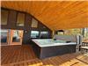 The living room is designed for comfort, with plenty of seating and large windows that frame stunning views of the river and surrounding landscape. Whether you're curling up with a book, watching your favorite movie, or simply enjoying the scenery, this space provides the perfect setting to relax and unwind. The warmth of the wood beams and natural finishes throughout the home adds a touch of rustic charm that makes this cabin feel both welcoming and luxurious.