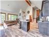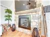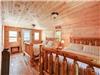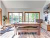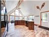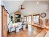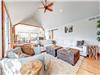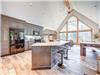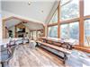 Inside, the open-concept layout combines modern design with classic cottage warmth. Large windows flood the space with natural light, while heated floors, vaulted ceilings, and a cozy fireplace create the perfect year-round atmosphere. The fully equipped kitchen is ideal for hosting large groups, featuring two full-size refrigerators, a large chest freezer, stainless steel appliances, cookware, coffee, tea, and pantry essentials. Gather around the farmhouse-style dining table for shared meals, or relax in the living area with an 85-inch Smart TV overlooking the lake.
