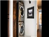 shower, custom cabinetry, marble flooring, and a washer/dryer