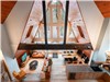 L'aire de vie principale est le cœur de la maison, avec plafonds de 30 pieds, magnifique foyer au gaz et grandes fenêtres donnant sur la forêt. Le salon peut accueillir confortablement six personnes — parfait pour soirées cosy, jeux de société ou films sur la télévision intelligente Samsung avec système de son.
